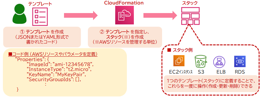 CloudFormationは、リソース構成を定義したテンプレートをもとに環境を構築し、その環境を「スタック」という単位で管理します。テンプレートはJSONまたはYAML形式で記述され、AWSリソースの構成や設定を定義する設計図の役割を果たします。