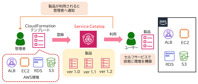 AWS Service Catalogは、組織が使用を承認したサービスやアプリケーションをポートフォリオとして作成・管理し、組織内の他のAWSユーザーへ共有できるサービスです。管理者は、CloudFormationテンプレートなどで定義したAWSリソースやアプリケーションを「製品」として登録し、他のユーザーに共有できます。共有されたユーザーは、ポートフォリオから必要な製品をセルフサービスでデプロイ(構築)可能です。製品の管理者は、製品のバージョンや、製品がいつ・誰に使用されたかを一元的に管理できるので、組織内のAWS環境の一貫性とコンプライアンスを維持できます。