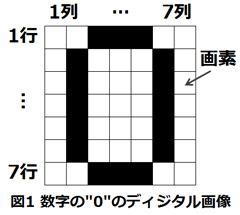 文字や図形を白黒で縦7画素,横7画素のディジタル画像で表すとき,数字の"0"を図1のように表現する。このディジタル画像を画素データとして出力する処理,画素データを圧縮する処理及びディジタル画像を回転させる処理について考える。