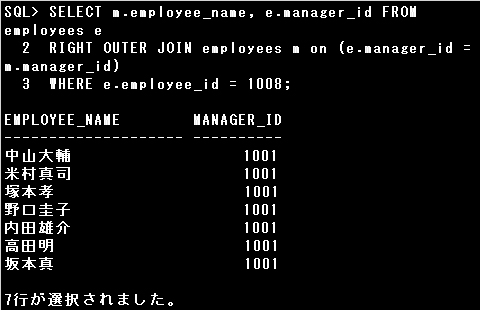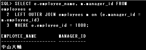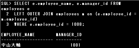 結合条件が「e.employee_id = m.employee_id」で、EMPLOYEE_IDが「1008」の従業員と同じEMPLOYEE_IDの従業員という条件になるため、「1008」の従業員名とその上司のMANAGER_IDが取り出されます。誤ったSQL文です。