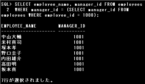 次に副問合せの方は、副問合せでEMPLOYEE_IDが「1008」の従業員のMANAGER_IDを取り出して、それと同じMANAGER_IDを持つ従業員を主問合せで取り出します。