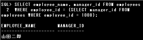 副問合せでEMPLOYEE_IDが「1008」の従業員のMANAGER_IDを取り出して、それと同じEMPLOYEE_IDを持つ従業員を主問合せで問合せています。「1008」の従業員の上司名とその上司に登録してあるMANAGER_IDが取り出されます。誤ったSQL文です。