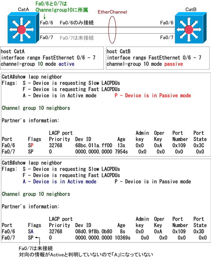 そのため、passiveモードにしているのはCatAのFa0/6の対向側ということになります。また、passiveモードとイーサチャネルを形成するモードは activeモードなので、CatA側はactiveモードにしていることもわかります。