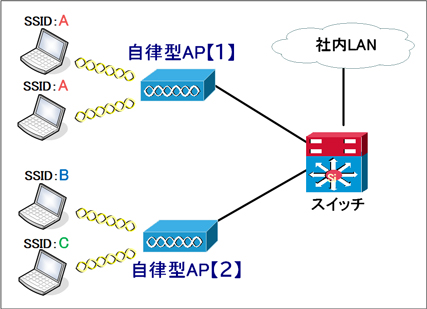 図のネットワークでは、各自律型APがそれぞれ異なるSSIDを提供している。
