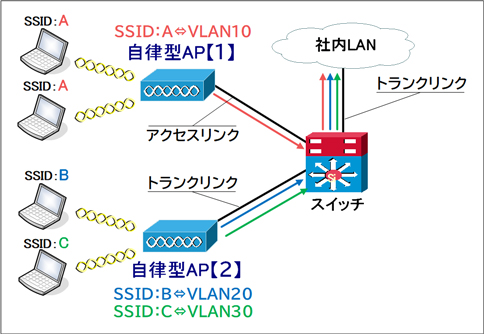 構成上の注意点:APとスイッチ間は複数のVLANを通すためにトランクリンクにする必要あり