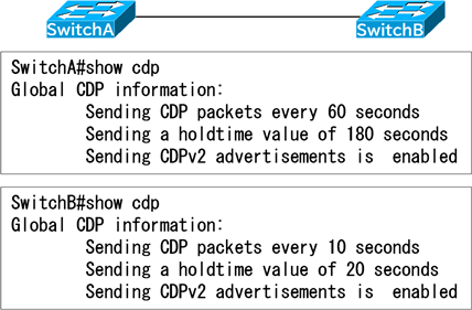 SwitchBが送信するCDPパケットのホールドタイムは20秒です。