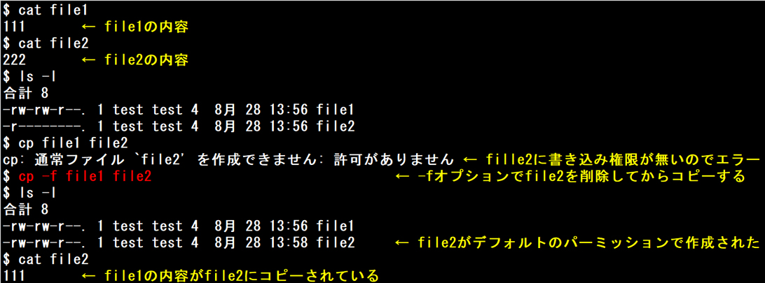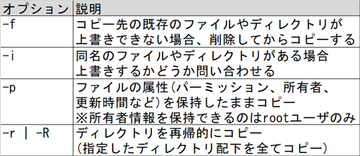 cpコマンドはデフォルトでファイルを上書きしますが、権限などの理由で書き込み先のファイルが書き込みオープンできない場合、「-f」オプションはそのファイルを削除してからコピーします。
