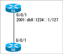 既にRAには、ホスト部の1ビットが1である「2001:db8:1234::1」割り当てられているので、残る利用可能なアドレスは、ホスト部が0である「2001:db8:1234::0」のみです。したがって、このアドレスがRBのGi0/1に割り当てるIPアドレスとして適切なアドレスとなります。