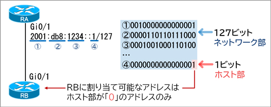 /127のプレフィックス長を持つネットワークでは、ホスト部分のビットは1ビットのみであり、この1ビットが「0」または「1」の2つのみが利用可能なホストアドレスです。