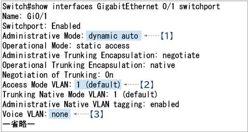 設問の設定後、「show interfaces GigabitEthernet 0/1 switchport」コマンドで設定を確認すると、以下のようになります。