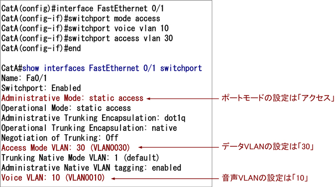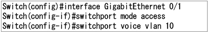 設問では、ポートをアクセスポートに設定し、音声VLANをVLAN「10」に設定しています。