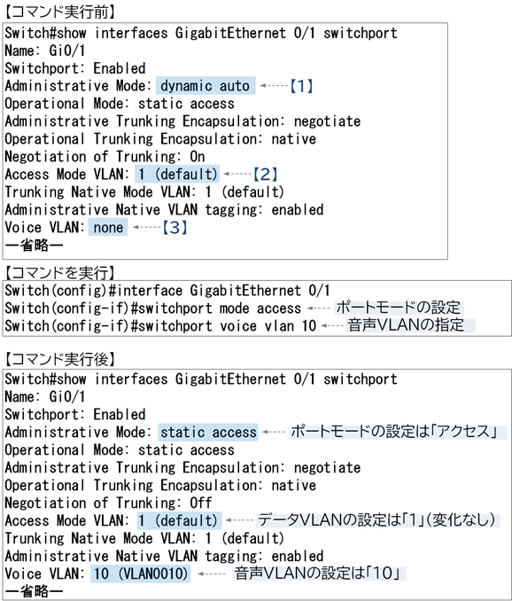 解説にもありますが、音声VLANを使用する場合、ポートはアクセスポートにします。