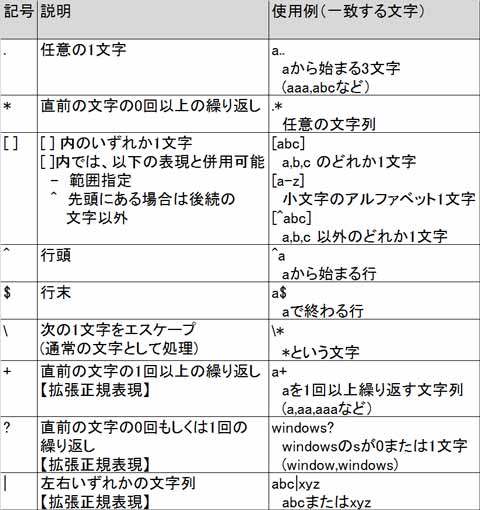 なお、拡張正規表現の「?」「+」は、基本正規表現では「\?」「\+」で同様の指定ができます。