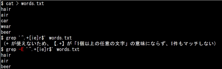 grepコマンドの検索パターンで拡張正規表現を使うには、-Eオプションを指定します(egrepコマンドと同様)。