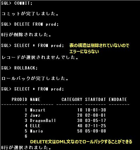 その上で、解説にもある通りDELETE文はDMLであり、DELETE文の実行で新しいトランザクションが開始され、コミットされるまではROLLBACKが可能です。