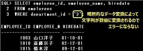 ただし、暗黙的なデータ変換はSQL文が分かりにくくなったり、パフォーマンスに悪影響を及ぼす場合があります。