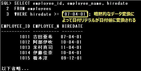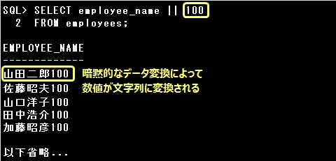 暗黙的なデータ変換とは、データ型の変換が意味を持つ場合に、Oracle Databaseが自動的に行う変換です。以下のような場合に変換が行われます。
