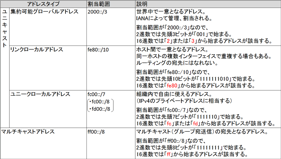 IPv6のアドレス範囲はIANA(Internet Assigned Numbers Authority)によって、以下のように役割ごとにアドレス範囲が決められています。