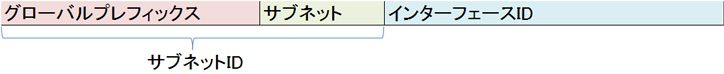 IPv4でのホストアドレスに当たるインターフェースIDは、アドレス自動設定機能を活用するために64ビットにするのが一般的です。そのため、前半64ビットのうちプロバイダから割り当てられたプレフィックス分を除いた部分がサブネット用のビットになります。割り当てられたプレフィックス(グローバルプレフィックス)とサブネットまでの部分とプレフィックス長を合わせてサブネットIDと呼びます。
