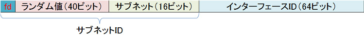 ユニークローカルアドレス(Unique Local Address:ULA)はIPv4でのプライベートアドレスと同じ目的で使われます。アドレスのフィールドは以下の4つにわけられます。