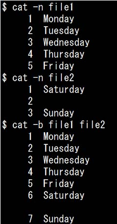 catコマンドの引数にファイルを複数指定すると、ファイルを連結して出力します。ファイル名が指定されない場合、または「-(ハイフン)」が指定された場合は標準入力から受け取ったデータを標準出力に表示します。