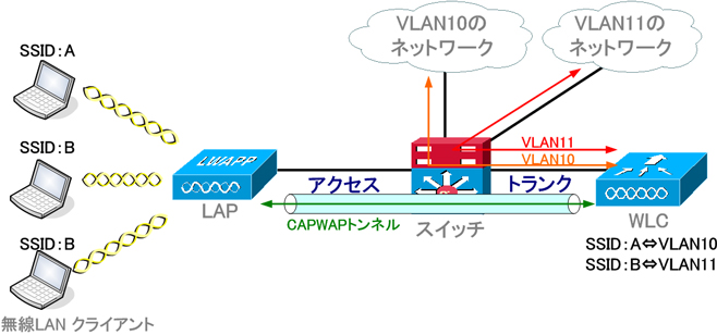 図のネットワークではLAPとスイッチ間がトランクリンクで接続されている。