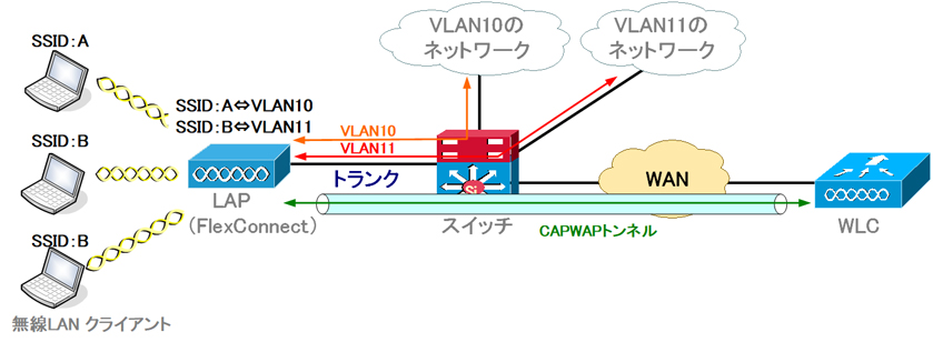 一方、LAPとスイッチ間をトランクリンクで接続するのは、WLCを介さず、APがデータ転送を行う「ローカルスイッチング」の場合です。