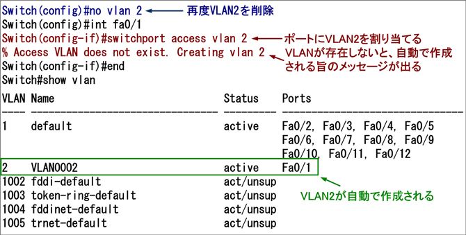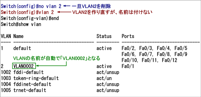 但し、実はポートにVLANを割り当てる際、そのVLANが作成されていなければ、VLANが自動で作成され、上記と同様にVLANの名前も自動で付きます。