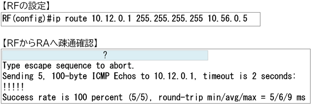 出力結果より、「!」が表示されているので、RFからRAへのpingが成功しているといえます。