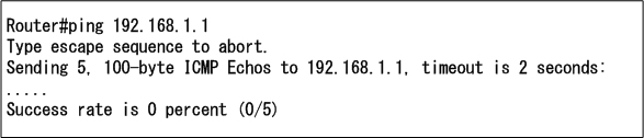 上記は「192.168.1.1」宛にICMPエコー要求を5個(デフォルト)送信し、2秒以内(デフォルト)にICMPエコー応答が返ってきていないことを表しています。(ping失敗)