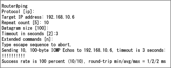 上記は「192.168.10.6」宛にICMPエコー要求を10個送信し、3秒以内にICMPエコー応答が返ってきていることを表しています。(ping成功)