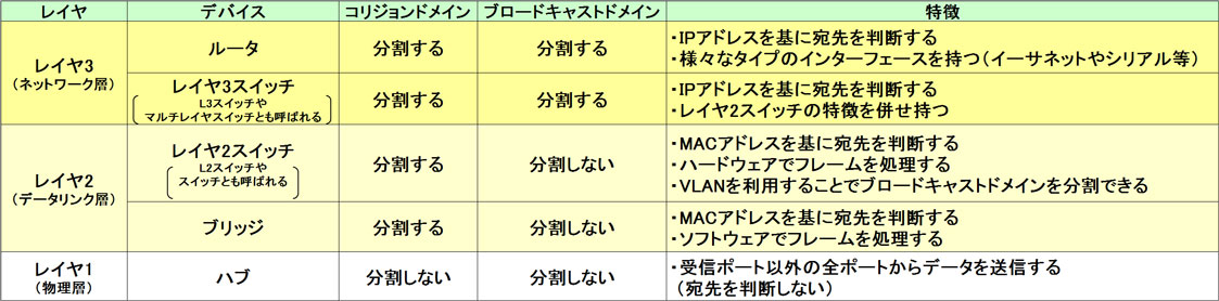 【主なデバイスのブロードキャストドメインとコリジョンドメイン】