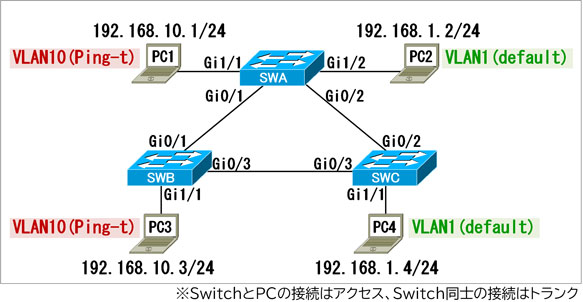 ※SwitchとPCの接続はアクセス、Switch同士の接続はトランク