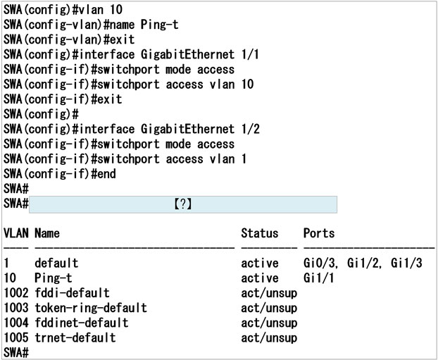 設問の出力結果から、構成図通り適切にVLANの作成と割り当てが行われていることが読み取れます。