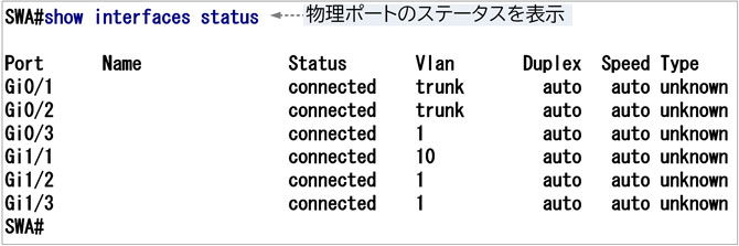 「show interfaces status」は、物理ポートのステータスを表示するコマンドです。