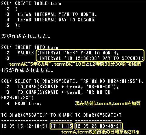 INTERVAL YEAR TO MONTH型やINTERVAL DAY TO SECOND型に値を格納するためには、以下のような期間リテラルを使用します。負の数値も格納できます。