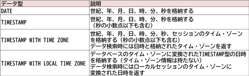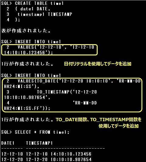 DATE型やTIMESTAMP型の列に値を格納するためには、日付リテラルを使用するか、文字列や数値をTO_DATE関数、TO_TIMESTAMP関数でそれぞれDATE型、TIMESTAMP型の値に変換します。