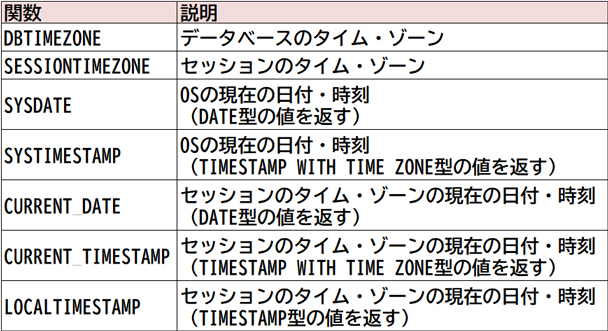 以下はデータベースのタイム・ゾーンや日時を返す関数です。