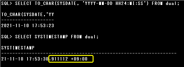 SYSDATEがDATE型で現在の日時の秒までを返すのに対し、SYSTIMESTAMPはTIMESTAMP WITH TIME ZONEデータ型で返します。TIMESTAMP WITH TIME ZONEデータ型は、DATE型の値に加え秒の小数点以下の値とタイム・ゾーンの情報も含みます。