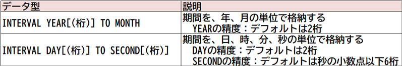 INTERVAL YEAR TO MONTH型は期間を年、月の単位で格納します(「5年6カ月」など)。
