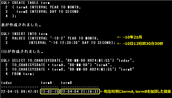 以下はINTERVAL YEAR TO MONTHの年と、INTERVAL DAY TO SECONDの日に負の数値を格納した場合の例です。