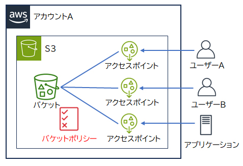 S3アクセスポイントは、既存のS3バケットに専用のエンドポイントを作成できる機能です。1つのバケットに複数のアクセスポイントを設け、それぞれに個別のアクセス制御ポリシー(アクセスポイントポリシー)を設定できます。これにより、部門やアプリケーションごとに異なるアクセスルールを独立して管理でき、バケットポリシーが複雑化するのを避けられます。