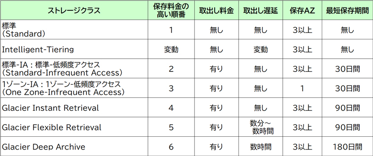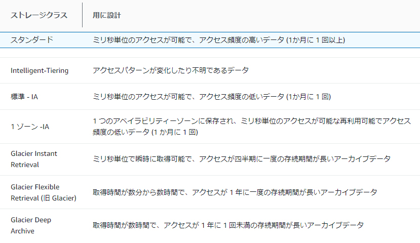 Amazon S3のストレージには複数の種類(ストレージクラス)があります。ユーザーはデータへのアクセス頻度、必要とする可用性、最小保存期間などに応じて保存するストレージクラスを選択します。