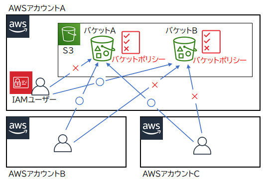 S3ストレージ上のバケットやオブジェクトは、デフォルトではバケットやオブジェクトを作成したAWSアカウント(S3リソースの所有者)だけがアクセスできます。権限を制限されたIAMユーザーや、他のAWSアカウントからS3リソースへアクセスできるようにするには、S3リソースの所有者であるAWSアカウントでオブジェクトやバケットへのアクセス制御を行います。