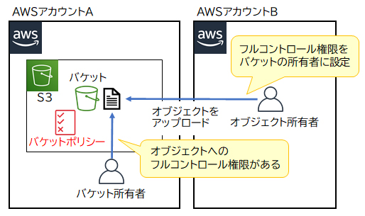 S3のオブジェクトはアップロードしたAWSアカウントが所有権を持ちます。バケットを複数のAWSアカウントで共有している場合も、バケットの所有者とは違うAWSアカウントがアップロードしたオブジェクトの所有権はアップロードしたAWSアカウントが持つので、バケットの所有者はオブジェクトに対してフルコントロール権限がありません。