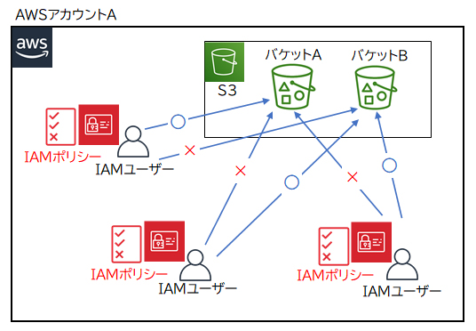 IAMユーザー単位でアクセス権限を設定するIDベースのポリシーです。自AWSアカウントのIAMユーザーやグループ、ロールに対して、S3リソースへのアクセス権限を設定します。バケットポリシーとは違い、他のAWSアカウントには設定できません。