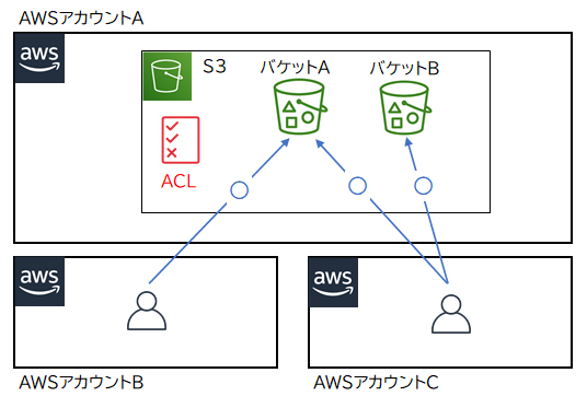 AWSアカウント単位でアクセス権限を設定する機能です。他のAWSアカウントに対して、S3バケットやオブジェクトへの読み取りまたは書き込みを許可します。