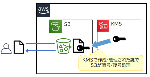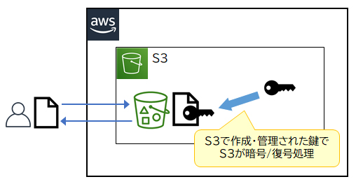 データがS3に保存されるタイミングで自動的にS3が暗号化を行います。データを取り出すときはS3がデータを復号して、ユーザーに渡します。