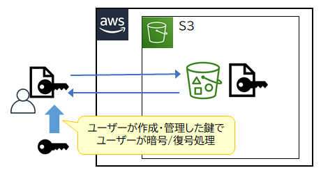 データをS3へアップロードする前にクライアント側で暗号化を行い、暗号化したデータをそのままS3に保存します。データを取り出すときは、暗号化したデータをS3からダウンロードした後、クライアント側で復号します。