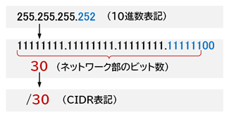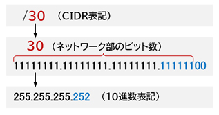 サブネットマスク「255.255.255.252」を例に、10進数表記とCIDR表記の変換手順を示します。
